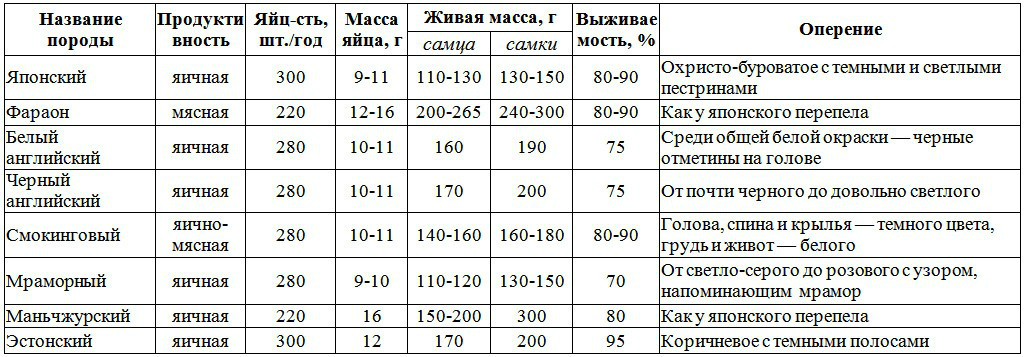 Приводим сравнительную таблицу, указаны основные породы перепелов и их характеристики.